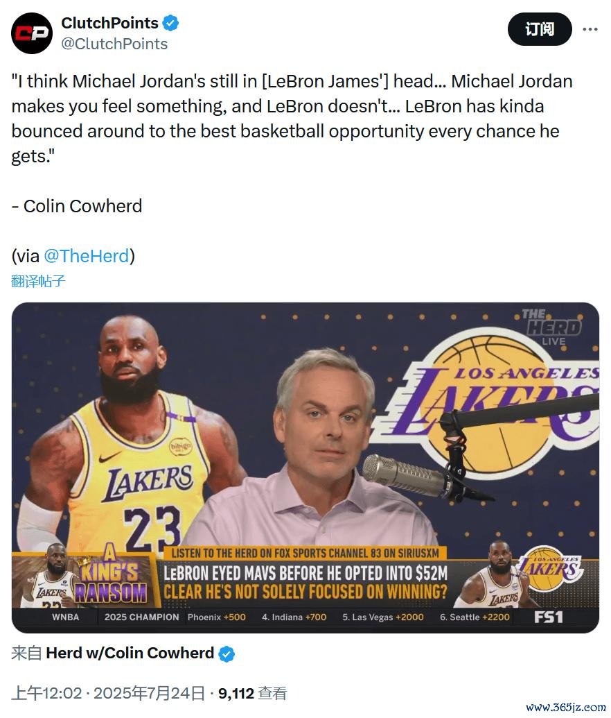 北京时间7月25日,NBA进入休赛期。著名媒体人Colin Cowherd近日发布了一则有关乔丹和詹姆斯的评价nba季后赛,他直言乔丹依然是詹姆斯心中的阴影,詹姆斯多次跳槽到好的球队环境,但是依然取得乔丹的成就。