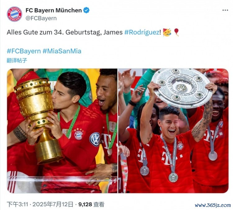 7月12日讯 今天是哥伦比亚球星哈梅斯-罗德里格斯的34岁生日,老东家拜仁为他送上祝福。