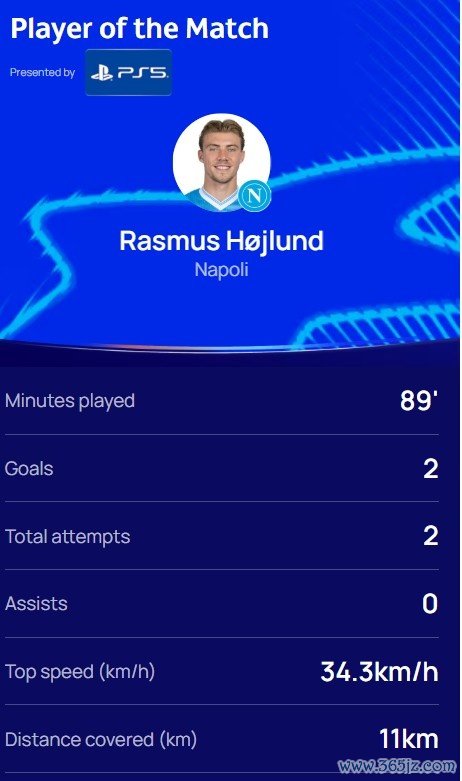 连进两球,官方:霍伊伦当选那不勒斯2-1葡萄牙体育全场最佳