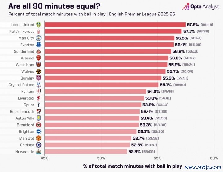 10月10日讯 OPTA统计了本赛季至今英超20队净赛事 时间占据总赛事 时间的比率,利兹联居首,葡超新闻网五大联赛纽卡、切尔西、曼联倒数前三。