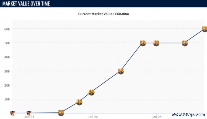 费尔明目前已经代表巴萨一线队出场93次,贡献21球11助,球员德回转 价也由两年前的800万欧元上涨至如今的6000万欧元