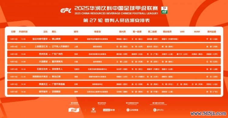 10月18日讯 2025华润饮料中甲职业联赛 第27轮裁判 选派结果公布,葡超新闻网五大联赛其中苏州东吴vs广东广州豹、南通支云vs广西平果两场焦点战役安排有VAR裁判 。