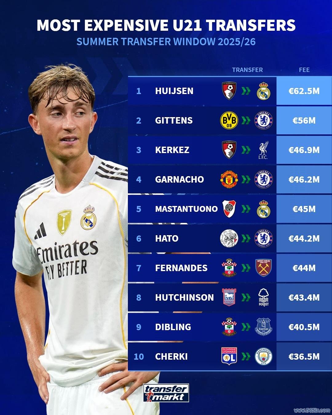 今夏转会最贵的U21球员: 赫伊森居首, 吉滕斯、加纳乔在列
