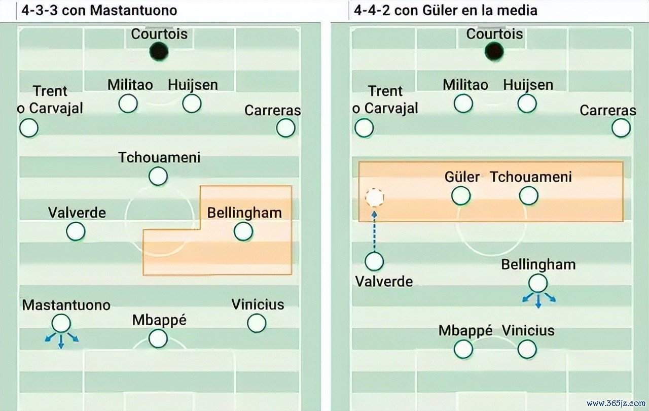 方案二:4 4 2均衡 阵,姆巴佩+维尼修斯双前场球员突前,中场球员由巴尔韦德 贝林厄姆 居莱尔和琼阿梅尼四人掌控,贝林厄姆位置灵敏度,游弋在锋线身后寻找杀机,而巴尔韦德则需兼顾右路防卫 。