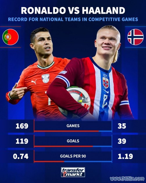 德转将哈兰德得分 数据与C罗进行对比,后者国家队169场119球。
