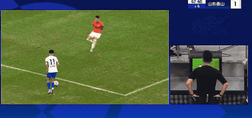 上半场补时阶段,刘洋传中,克雷桑包抄,刘军帅倒地封堵,皮球打在他的撑持 手上,VAR介入,裁判 判决 十二码球。