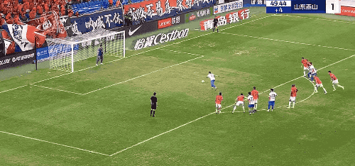 第60分钟,青岛海牛获得定位球,萨里奇的射球 绕过人墙,王大雷扑了一下,皮球击中横梁。