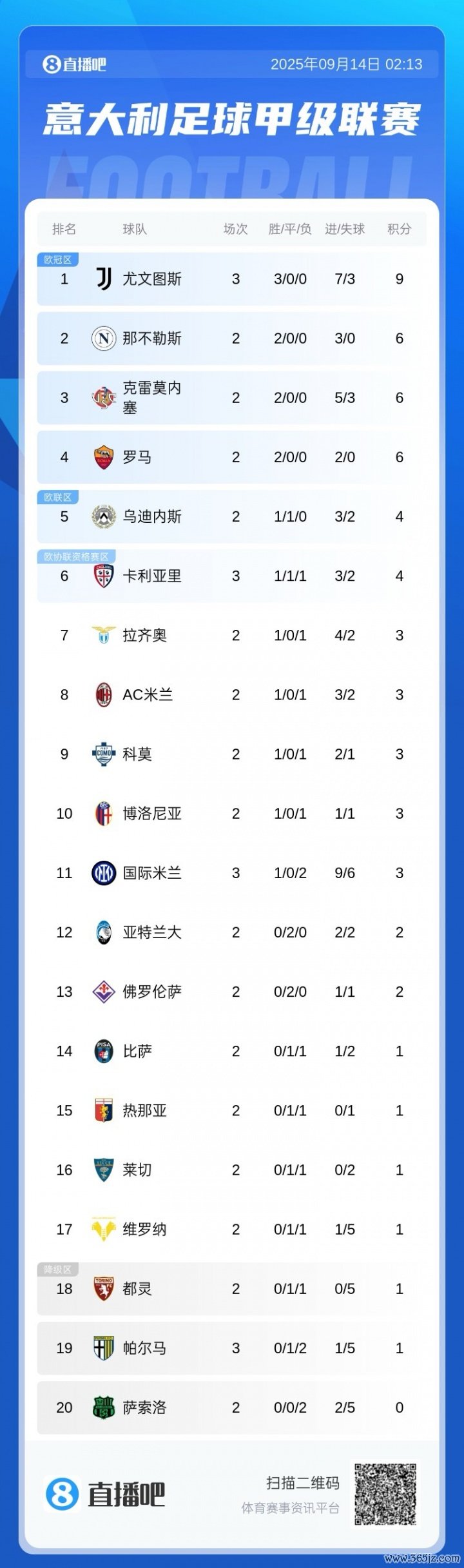 意甲积分榜:尤文三连胜暂9分领跑!国米遭两连败掉出前10