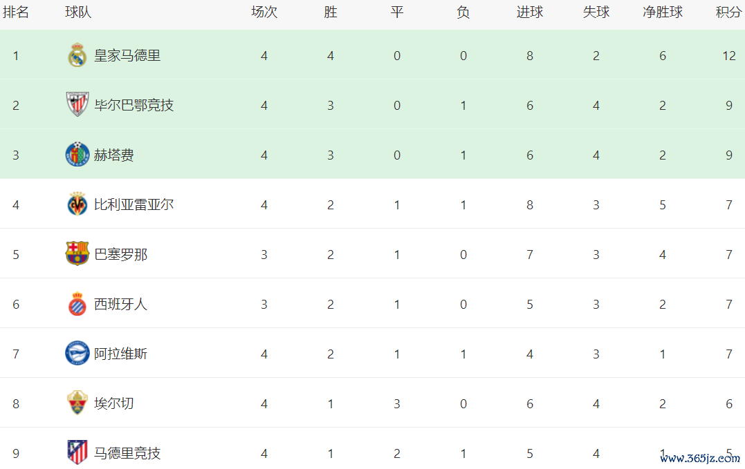 在积分榜上,皇马以12分排名榜首。皇马是西甲唯一全胜的球队,4场职业联赛 都赢了足球竞猜,无疑是夺魁 最大热门。毕尔巴鄂竞赛 拿到9分,排名第2。赫塔费也是9个积分,排名第3。第4的是比利亚雷亚尔,拿到7分。巴萨也是7分,排名第5。不过,巴萨只踢了3轮赛事 。马竞1胜2平1负,只拿到5分,排名第9。