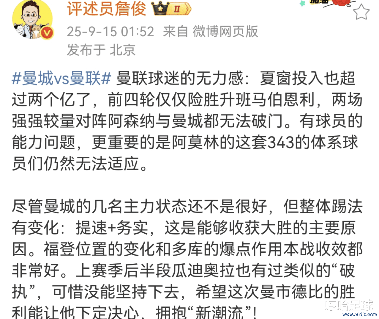 与曼城的赛事 结束后,詹俊这样评价曼联的表现,他写到:曼联有球员的能力问题,但更重要的是曼联球员无法适应阿莫林的343体系。的确,这支曼联的球员实力不够突出,但曼联的最大问题其实还是阿莫林的执教水平。阿莫林离开葡萄牙体育后,葡体照样夺得葡超第一名 ,阿莫林来到曼联后,红魔彻底失去前进的方向。