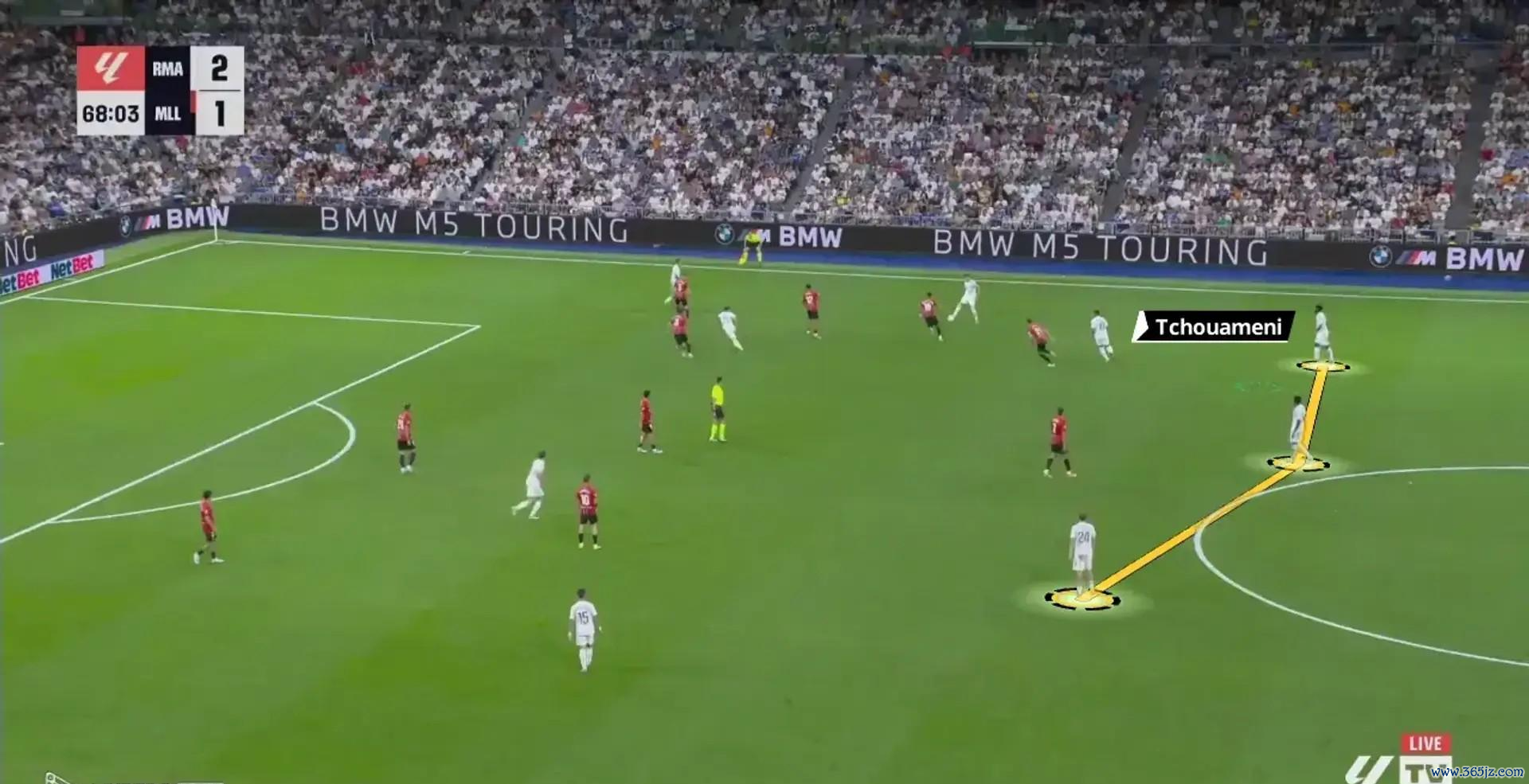 (阵形 示意图:假设为4-3-3,锋线维尼修斯-右路轮换,中场球员楚阿梅尼-巴尔韦德-居莱尔)