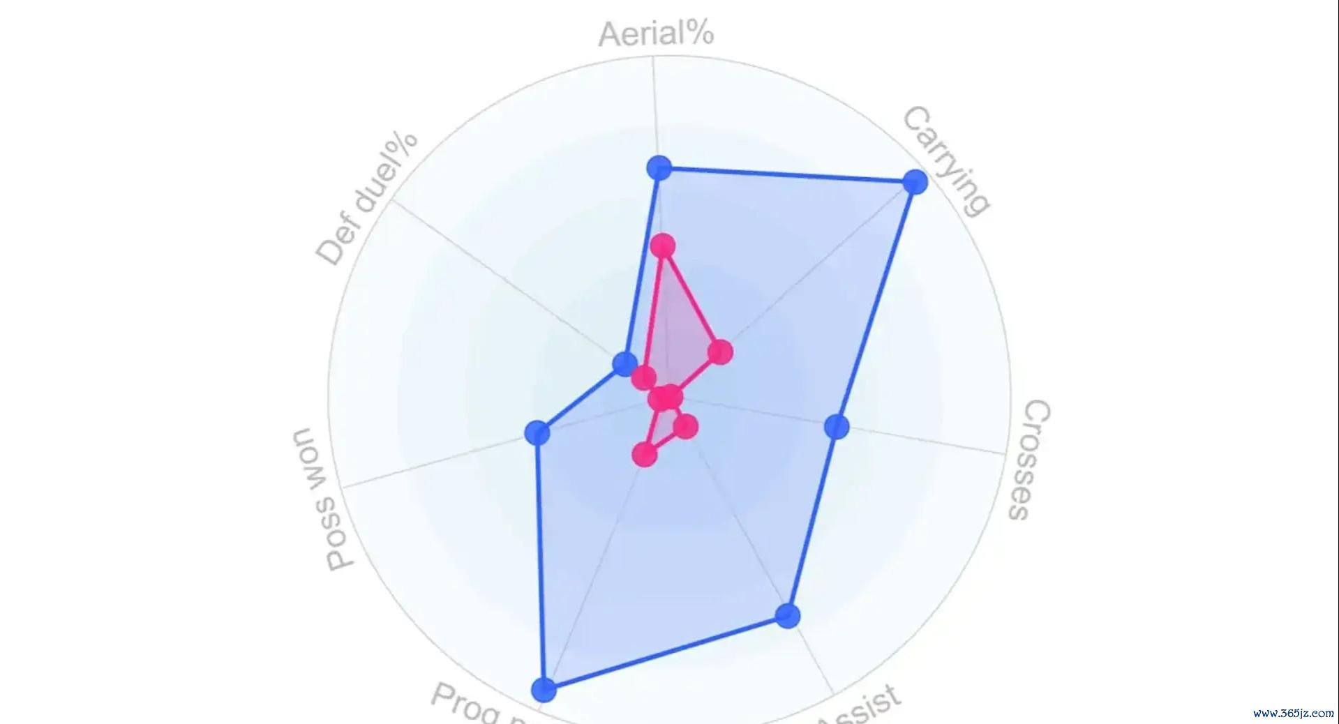 工作量数据证实了这一点:卡雷拉斯当前的产出(蓝色)与门迪上赛季(红色)相比显示出巨大差异,尤其是在推进传送球 、传中和预期助功 方面。
