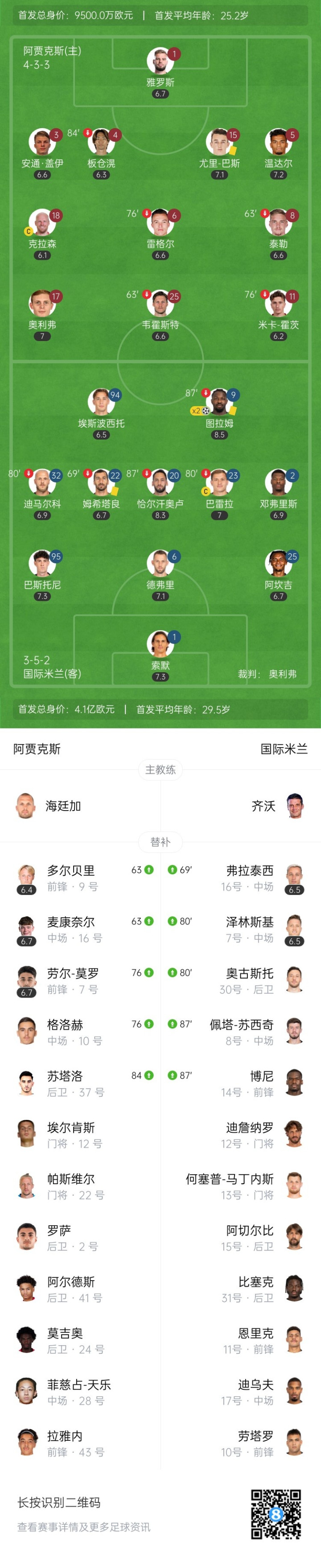 下半场加时补赛3分钟,全场赛事 结束,最终国米2-0阿贾克斯。