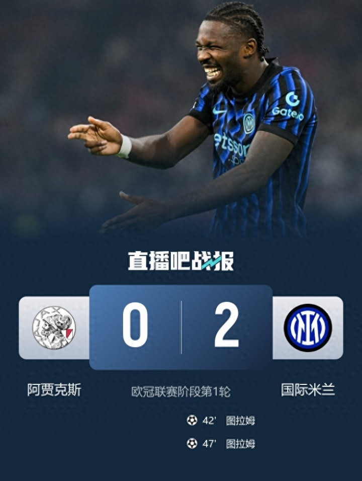 国米2-0阿贾克斯取欧冠开门红 小图拉姆双响恰尔汗奥卢两助功